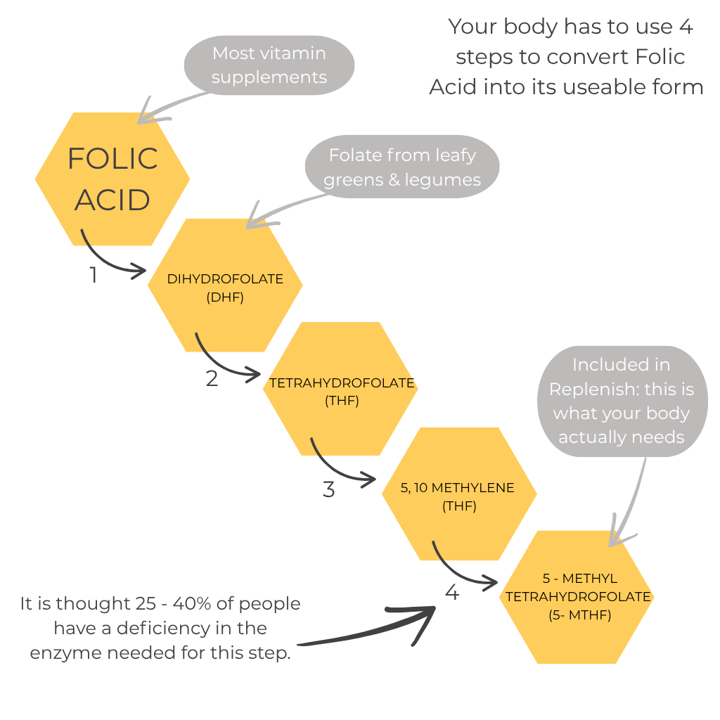 Replenish contains 5-Methyltetrahydrofolate, (or methylfolate to it's friends!) which is what your body uses, so you know your body is getting what it needs!